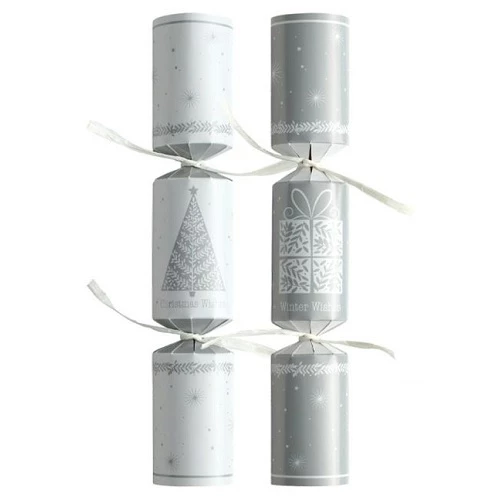 Deze originele Tom Smith Christmas Crackers uit Engeland zijn 25 cm lang en 4,5 cm. dik. Om en om zilver en wit bedrukt met een kerstboom en een cadeautje. Deze zogenaamde catering crackers worden veel door de horeca gebruikt. De crackers bevatten een knalletje, een papieren hoedje, een grap of spreuk en een kaartje met bijvoorbeeld een puzzel, doolhof of Sudoku.
