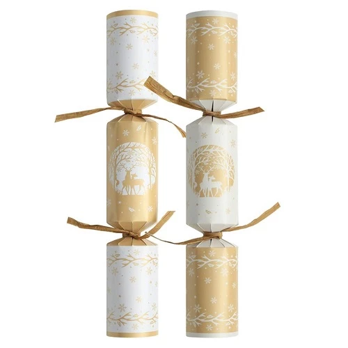 Deze originele Tom Smith uit Christmas Crackers uit Engeland zijn 28 cm lang en 5 cm. dik. Om en om wit en beige/goud bedrukt met een winterse rendieren afbeelding. Deze zogenaamde catering crackers worden veel door de horeca gebruikt. De crackers bevatten een knalletje, een papieren hoedje, een grap of spreuk en een kaartje met bijvoorbeeld een puzzel, doolhof of Sudoku.