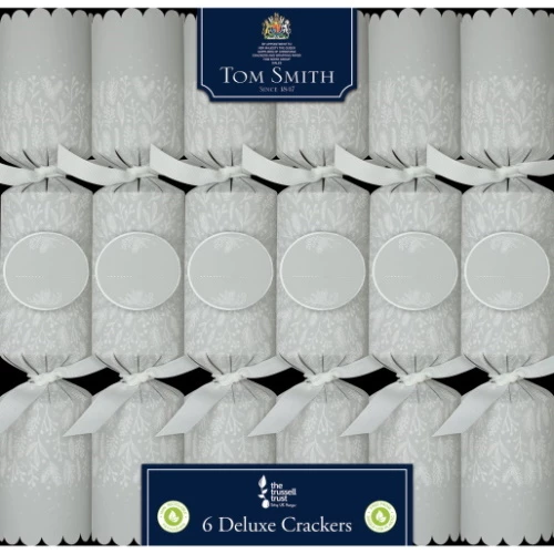 Deze 6 prachtige extra grote crackers van 33cm lang en 5,5cm dik zitten in een mooie geschenk doos. Ze zijn wisselend wit met een traditionele zilveren opdruk.