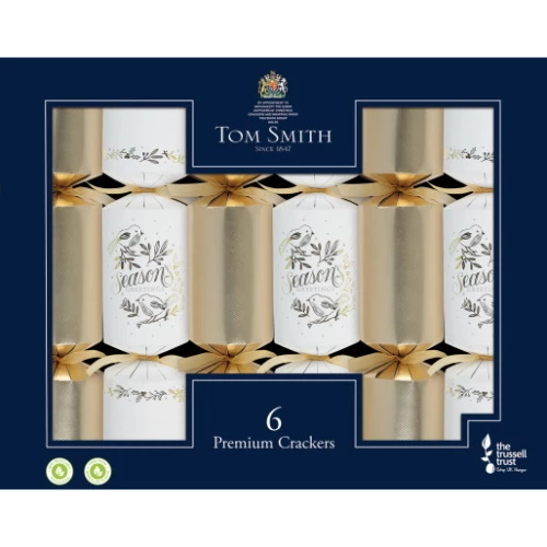 Deze 6 prachtige extra grote crackers van 33cm lang en 5,5cm dik zitten in een mooie geschenk doos. Ze zijn wisselend volledig goud en wit en versierd met de tekst “Season Greetings”. Dichtgeknoopt met mooi goud lint.