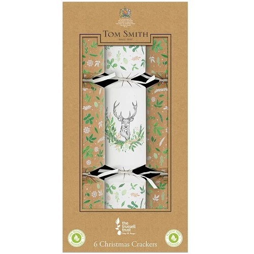 Deze 6 prachtige grote Tom Smith crackers van 30cm lang en 4.5 cm dik zitten in een mooie geschenk doos. Ze zijn wisselend van bruin en wit kraft karton gemaakt en hebben een mooie rendier en blaadjes print. Dichtgeknoopt met wit lint. Inclusief 6 tafel naamkaartjes. De cadeautjes in deze doos zijn kartonnen kerstboom hangers.