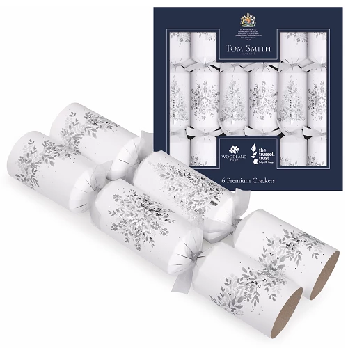 Deze 6 prachtige extra grote crackers van 35cm lang en 5,5 cm dik zitten in een mooie geschenk doos. Ze zijn wit in de basis en bedrukt met een zilveren kerstboom en zilveren kerstster. Dichtgeknoopt met een organza lint.