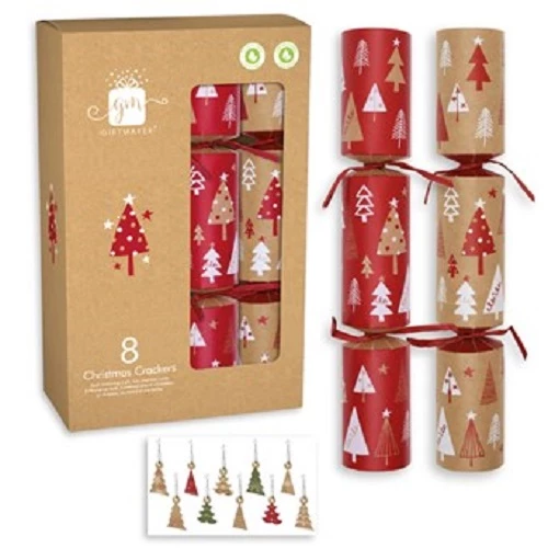 Een Christmas cracker trek je altijd met een knalletje open en bevat een klein cadeautje, een hoedje en een Engelstalige mop of grap. De cadeautjes in deze doos zijn leuke kerstboom hangers van karton.