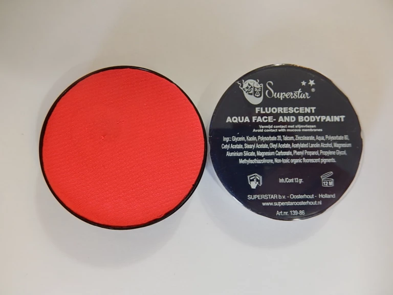 Deze schmink is zeer bijzonder. Bij gebruik van UV black light licht deze schmink zeer sterk op. In het donker zijn de beschilderde lichaamsdelen bijzonder goed waar te nemen. Deze schmink heeft een mooie structuur en is daarom ook geschikt voor gewone schminkfeestjes. Van dichtbij, zonder UV lampen, heeft het niet dezelfde zeer strakke dekking als gewone schmink. De gebruikte grondstoffen zijn ook van dien aard, dat het niet aan te bevelen is om de schmink dagelijks te gebruiken. Ook uit kijken met een overgevoelige huid. Topkwaliteit, want het is van Superstar. Waterbasis, dus met penseel of spons opbrengen en daarom ook makkelijk af te wassen. Alleen felle kleuren als op het plaatje, geen wit. De inhoud van dit kleine potje is 13 gram, ongeveer voor 6 volle gezichten.