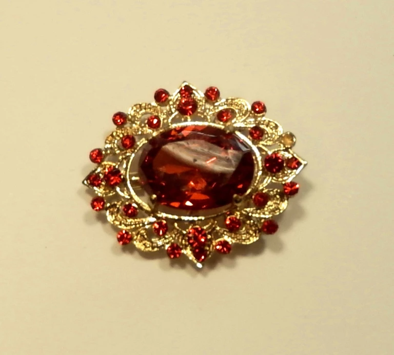 Zeer fraaie, kleine baretspeld. Ietwat ovaal met rode steen in het midden en kleine steentjes langs de zijkant. Aan de achterkant een speld om m op de baret te zetten, en een klein gootje, waarin 1 of 2 floss (dunne) veren gestoken kunnen worden