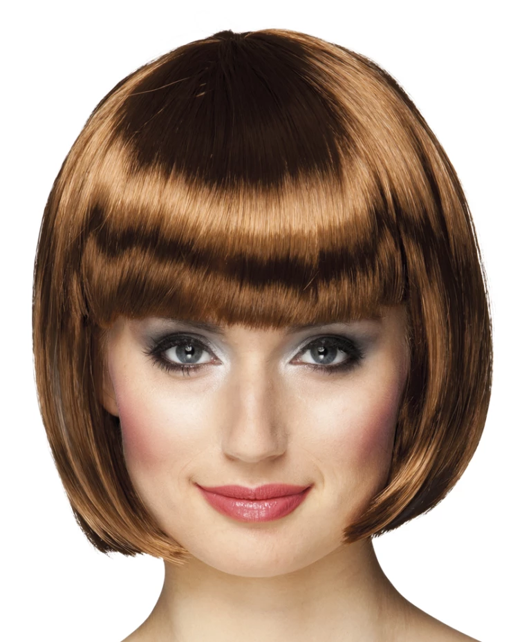 Mooie bruine pruik met strak kort haar en een rechte pony, oftewel een boblijn pruik. De bruine bobline is goed kambaar en zit stevig door de fijne hoofdkap.