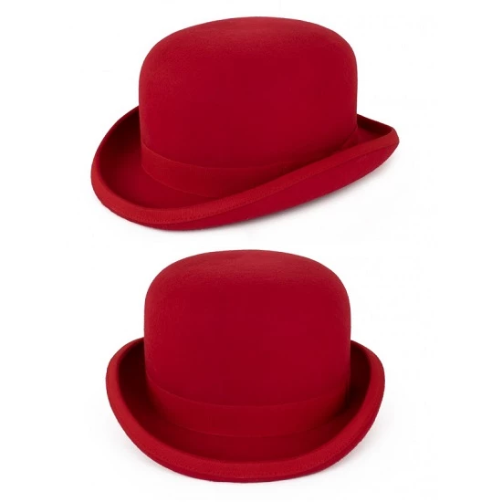 Mooie rode bolhoed van echt wolvilt. De bolhoed is one size en uiterlijk geschikt tot en met maat 60, maar door de elastieken binnenrand is de hoed ook voor kleinere maten tot 57 geschikt. Dus, samengevat; geschikt van maat 58 tot en met maat 60.