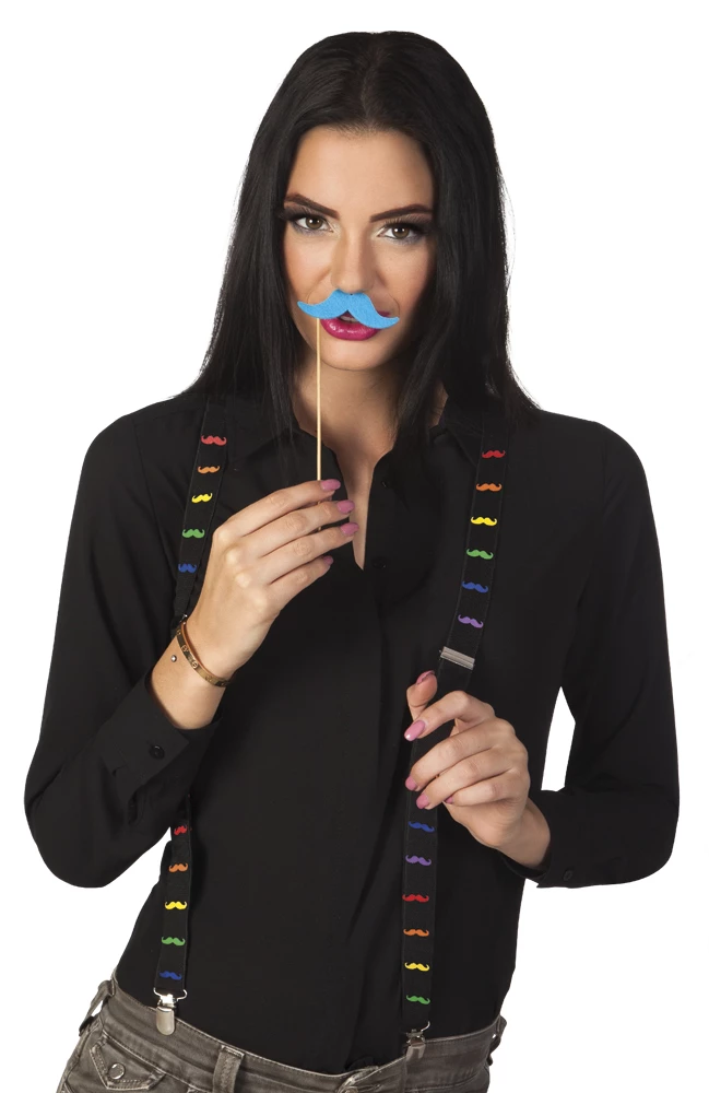 Super grappige bretels met neon snorretjes. De bretels zijn verstelbaar en met clipjes aan je broek te klemmen.