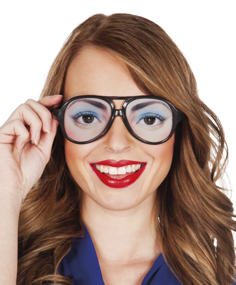 Geinige plastic bril met in het montuur een afbeelding van een paar ogen. Een heel apart effect.