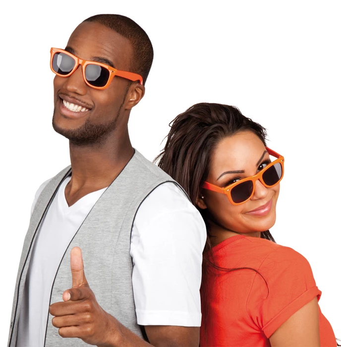 De traditionele Blues Brother bril in het oranje. Met donkere glazen, dus als het lekker zonnig is met Koninsdag beschermt hij ook nog eens goed je ogen.