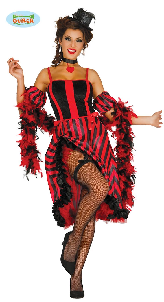 Rode jurk voor de Parijse can-can, een Westerse saloon girl of een sexy burlesque. Inclusief losse mouwtjes. Verkrijgbaar in twee maten medium, 38/40 en large, 42/44.