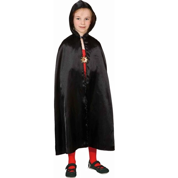 Mooie satijn achtige zwarte cape met een capuchon voor een kind. Goed voor elk Halloween figuur en mooi als Harry Potter verkleedkleding.