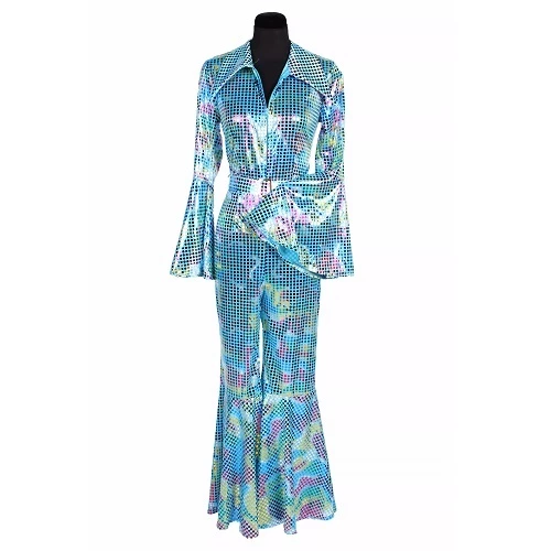 Tof Disco pak gemaakt van glimmende licht elastische turquoise blauwe stof. Het 70ties pak heeft de authentieke wijde pijpen en wijde mouwen en lange punten aan de boord. De jumpsuit komt inclusief riem en sluit met een ritssluiting aan de voorkant van het pak.