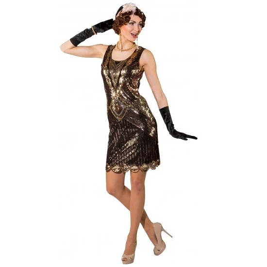 Prachtige korte Charleston jaren 20 jurk met een prachtige Art Deco pailletten print. De pailletten hebben de kleuren goud, koper en zwart en zorgen door die kleuren combinatie voor een chique warme look. De Great Gatsby jurk is licht elastisch en verkrijgbaar in de maten S/M en L/XL.