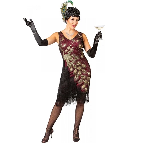 Prachtige bordeaux rode jurk voor een Charleston, Peaky Blinders of Roaring 20ties feestje. De jaren 20 jurk is gemaakt van licht elastisch materiaal en afgewerkt met een prachtige gouden bestikking van een pauw. Uiteraard ontbreken de flapper franjes ook niet.