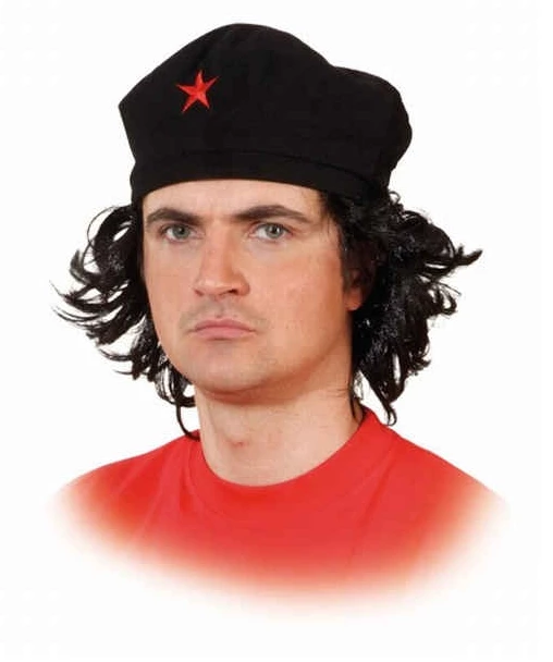 Zwarte muts of baret met zwarte haren eraan vast. Precies de baret en het haar van Che Guevara de Cubaanse verzetsstrijder.