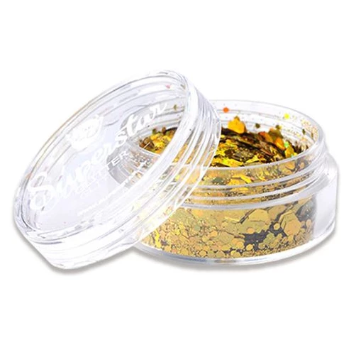 Een doosje met 6 gram chunky glitters. Chunky betekend in dit geval dat de glitters verschillend van vorm en formaat zijn. Deze Laser gold chunky glitters hebben een gouden kleur en zijn dé nieuwe festival trend. Breng hem op met huidlijm of simpelweg met de paint glow glitter fix gel en je hebt een geweldig effect!