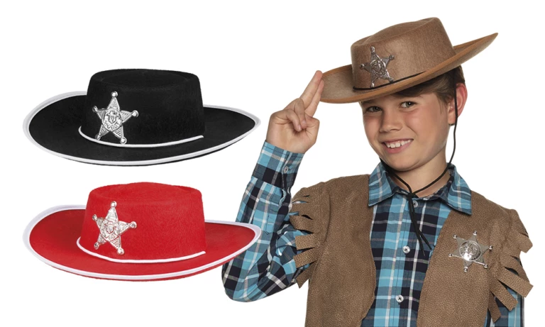 Mooie vilten kinder cowboyhoed. Verkrijgbaar in rood, bruin en zwart. Met een stoere sheriff ster op de voorkant en een touwtje om hem ook om je nek te kunnen hangen.