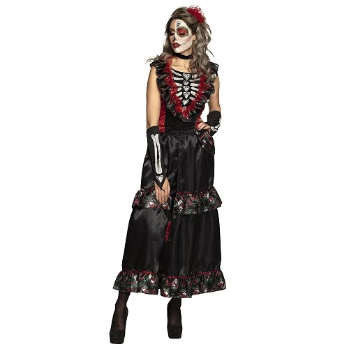 Mooie lange jurk in de stijl van Dia de los muertos. Het Mexicaanse dodenfeest. De jurk is op twee manieren te dragen, namelijk dicht aan de voorkant zodat je een lange jurk hebt, of open aan de voorkant zodat er een leuk kort rokje met skelet print tevoorschijn komt. Inclusief haaraccessoire, choker en handschoenen.