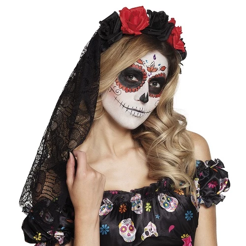 Mooie diadeem beplakt met rode en zwarte rozen en een lange kanten sluier waarvan kleine schedeltjes in het kant verwerkt zijn. Deze Day of the Dead diadeem is one size, maar past altijd.