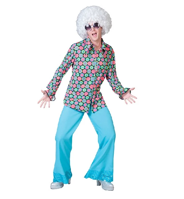 Toffe heren blouse voor een 70ties of discofeest. Passend bij de polkadot jumpsuit. Verkrijgbaar in verschillende maten.