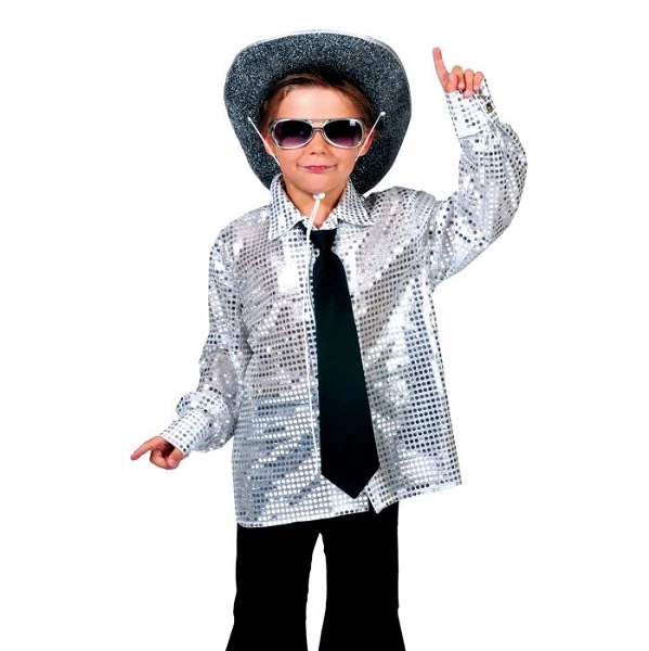 Je lijkt wel een discobal in dit glimmende zilveren disco shirt voor kinderen. De disco blouse is verkrijgbaar in verschillende kindermaten.