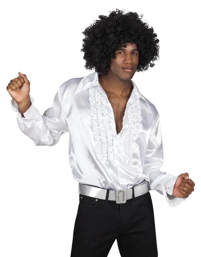 De bekende ruche blouse die bij een goede disco outfit niet mag ontbreken. Gemaakt van een lekker fout glimmend stofje en uiteraard met een borst vol ruches. Dit witte disco shirt is verkrijgbaar in diverse heren maten.