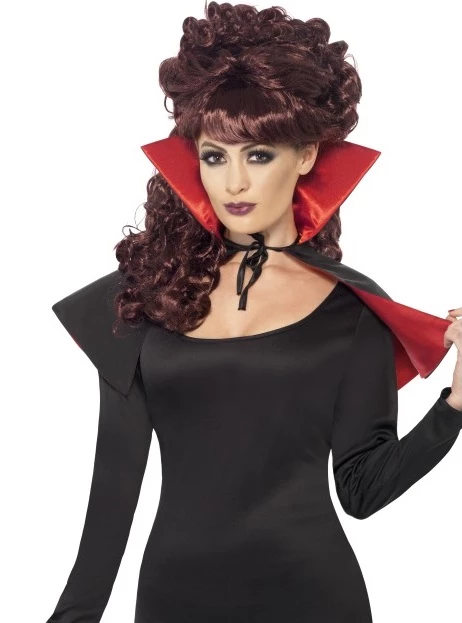De schattige versie van een niet zon schattig figuur. Dracula. Met een mooie opstaande kraag en een korte cape. Om te binden met een touwtje.