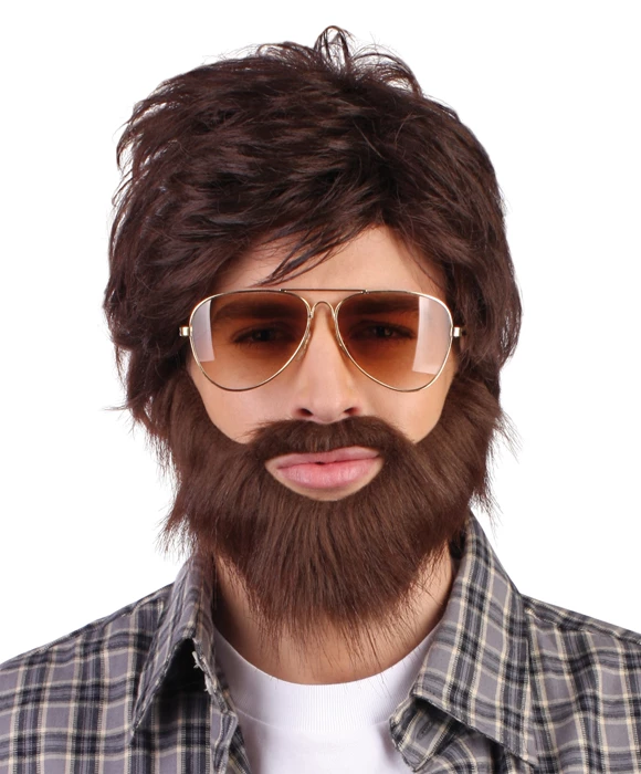 Kort bruin heren pruikje inclusief baard en snor. De baard en snor zijn één geheel. De bruine pruik is geknoopt op een elastische binnenkap zodat hij altijd past.