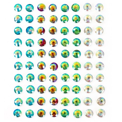 Een velletje met 80 gekleurde plak steentjes die je op je huid kunt plakken. Ze plakken uit zichzelf, maar voor echt goede plakkracht kun je ze beter nog even lijmen met huidlijm. De steentjes zijn 6mm groot.