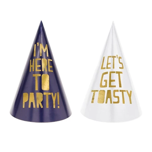 Een pakje met 6 feesthoedjes met in het goud de opdruk I’m here to party en Let’s get toasty.