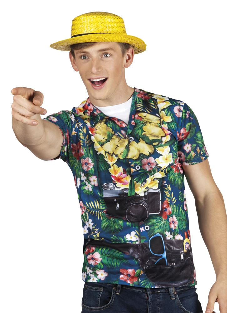 Stretch T-shirt met grappige print. In de geval de print van een Hawaii blouse met een fototoestel. Gemaakt van elastisch materiaal.