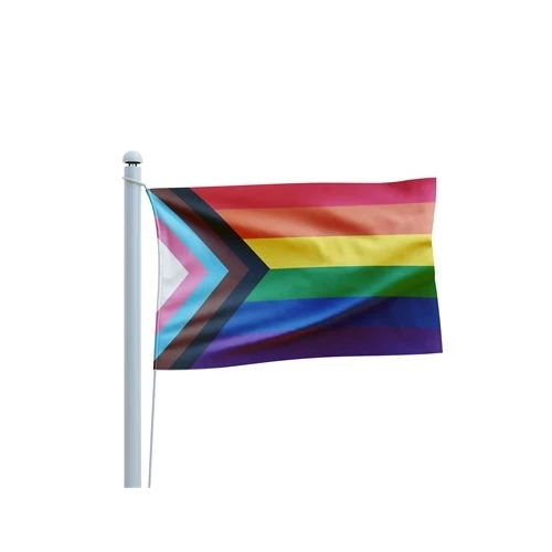 Progress vlag (90×150 cm) gemaakt van polyester. De vlag met regenboogkleuren en kleuren van de transgender gemeenschap, een zwarte en bruine streep, in de vorm van een pijl om de mensen van kleur in deze community te vertegenwoordigen.