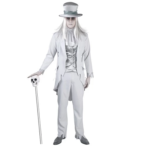 Deze spookachtige dode bruidegom dwaalt al eeuwen rond over de begraafplaats waar hij op zoek is naar zijn eeuwige liefde. Het is een mooi grijs/wit pak dat bestaat uit een broek, gilet, jas, jabot en hoed met haar. Met de perfecte kleur schmink erbij maak je van dit ghost groom kostuum het ultieme Halloween pak. Verkrijgbaar in twee maten, 50/52 S/M en 54/56 L/XL.