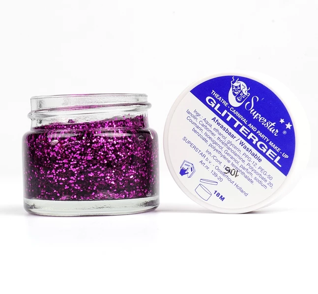Glitter gel voor op de huid in een potje van 15ml. Deze gel is op waterbasis. Wel lekker plakkerig, maar ook makkelijk afwasbaar. Nooit op je ooglid gebruiken, want er kan zo’n glittertje in je oog vallen en daar kan je dan last van hebben. Niet van glas, maar gemaakt van zachte kunststof, dus verder niet gevaarlijk. Ook perfect in je haar te gebruiken en dan is het weer met shampoo in één keer goed uit te wassen. Kan ook perfect over een schmink aangebracht worden. Je kan deze gel ook zeer goed uitsmeren, waardoor maar hier en daar een glimmertje krijgt. dan wordt het soort vage bodyglitter. Kortom: bruikbaar voor vele doeleinden.