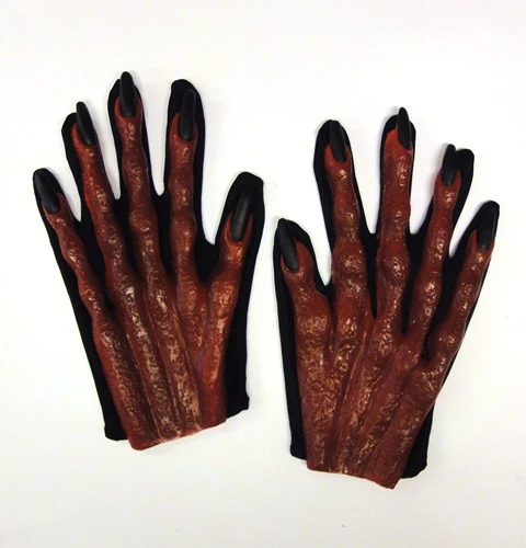 Zwarte stretch handschoenen met latex duivelhanden. Door het soepele latex kun je je vingers gewoon nog bewegen. One size. Voor volwassenen of grote kinderen.