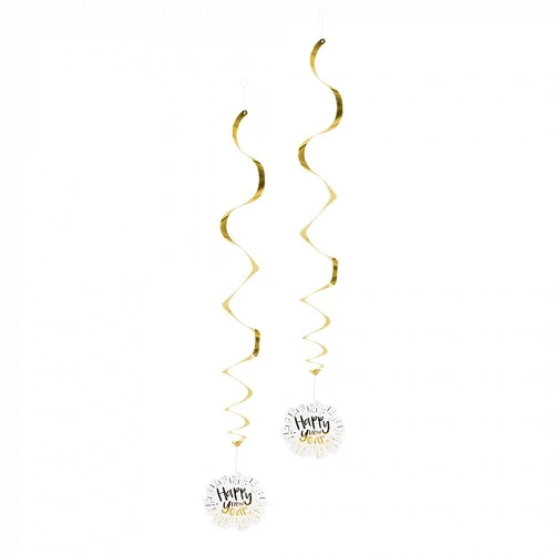 2 feestelijke hangdecoratie swirls met de tekst Happy New Year.