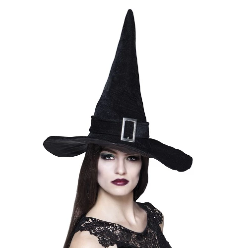 Grote zwarte imitatie fluwelen heksen hoed met een zilveren gesp op de voorkant. Geschikt voor volwassenen.
