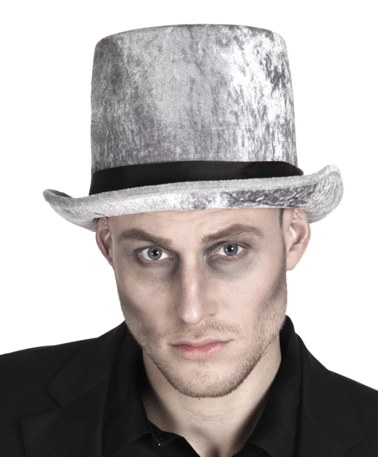 Mooie grijze hoge hoed voor een ghost groom of grafgraver of ander Halloween figuur. De hoed is gemaakt van fluweel achtig materiaal en is ongeveer hoofdmaat 58/59.