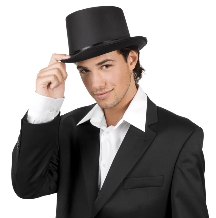 Mooie zwarte hoge hoed gemaakt van glimmend satijn lijkend materiaal. Stevige kwaliteit. One size, ongeveer hoedenmaat 58.