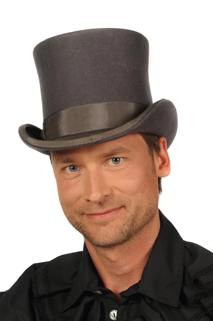 Deze prachtige grijze hoge hoed van 100% wolvilt is gevoerd met een 100% polyester witte satijn en is voorzien van een voeringband, de hoogte van deze hoogwaardige zylinder is 14 cm. Verkrijgbaar in verschillende hoofdmaten.
