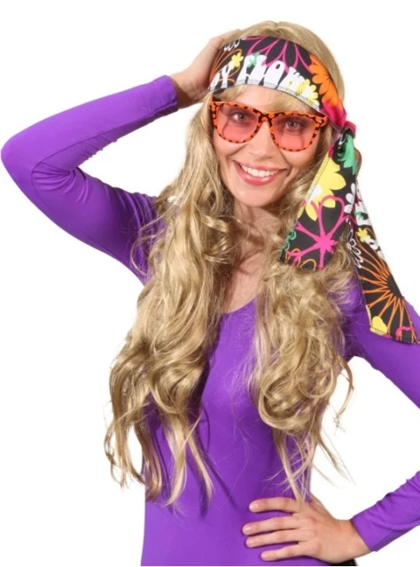 Vrolijke lange stoffen hippie hoofdband of sjaaltje in de bekende 60ties en 70ties hippie kleuren. Past iedereen want knoop je zelf gewoon om. Kan dus ook prima om een pruik heen.