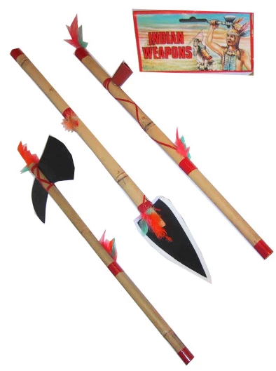 3 delige set met wapens voor een Indiaan, bestaande uit een speer, een pijp en een bijltje. Om je vertolking van een Indiaan nog overtuigender te maken!