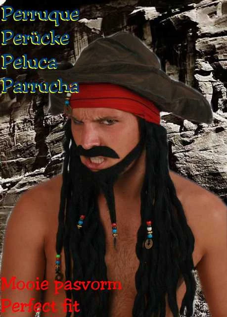 Set van een baard, snor en bandana met haar. Exclusief hoed. De snor en de baard kunt u plakken met de bijgeleverde stickertjes of, voor de hele avond plezier, met speciale huidlijm. De bandana bind je om je hoofd en daar hangen dan de dreadlocks aan. Let op, de bovenkant van je hoofd is dus niet bedekt, dus daar zie je je eigen haar. Op te lossen door een hoed op te zetten.