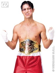 Plastic gouden gordel voor een bokser. Te gek bij een Rocky outfit! Om te binden met een touwtje.