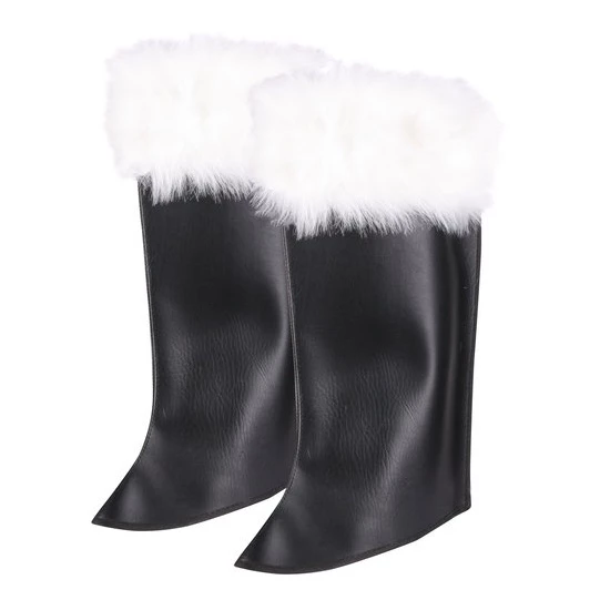 Ideaal! Deze beenkappen of laars kappen voor bij je Kerstman kostuum. Zwart nepleer met een rand van wit imitatiebont, past over elke schoen. Met het elastiek dat onder je schoen gaat blijven ze goed op hun plek zitten.