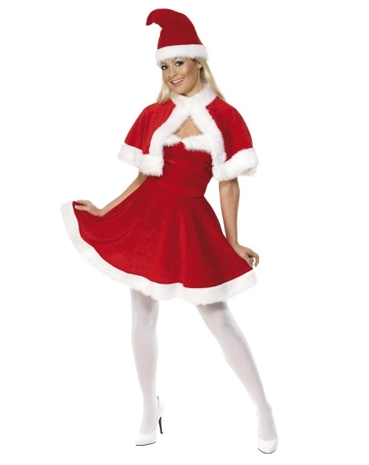 Mooi kerstjurkje dat bestaat uit een jurkje, muts en cape. Het kostuum is gemaakt van imitatie fluweel en is licht rekbaar voor een fijne pasvorm.