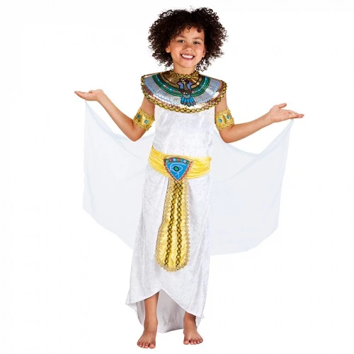 Mooie Egyptische jurk voor een kind. Het Egyptische Cleopatra kostuum bestaat uit een witte jurk, een riem, een kraag en twee armbanden.