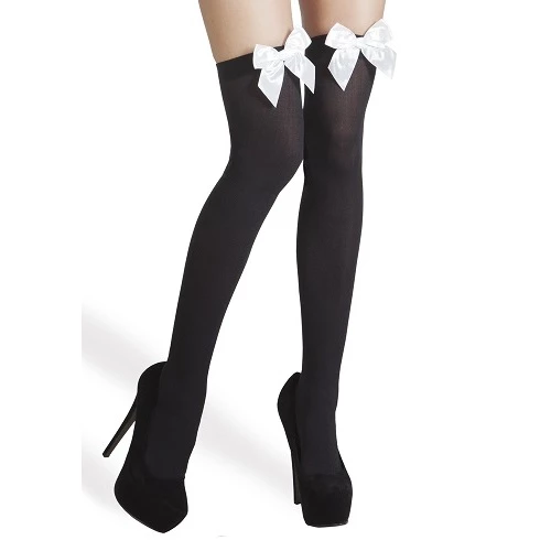Zwarte kousen met witte strikjes. One size. Blijven goed zitten door de verstevigde elastieken rand.