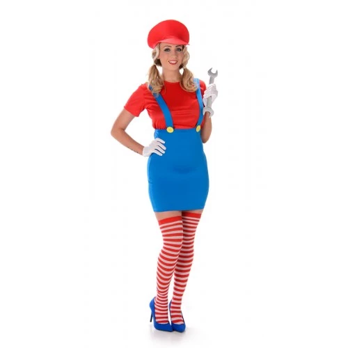 Elastisch jurkje van de Nintendo held Super Mario. Het Mario kostuumpje bestaat uit een shirt, rokje met bretels, de kousen en pet en is verkrijgbaar in verschillende damesmaten.